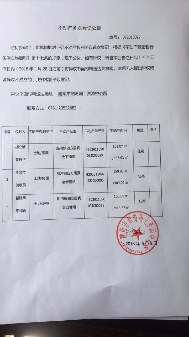 不动产首次登记公告(胡立波 黄丹华、李文才 何秋员、瞿建辉 阳梅香)