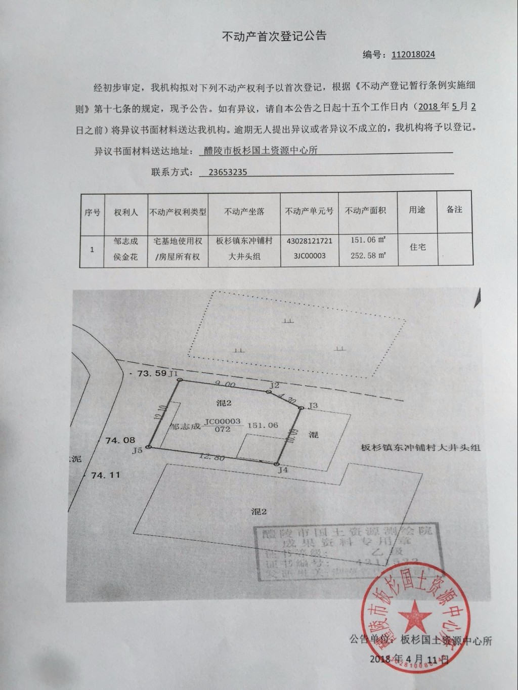 不动产首次登记公告(邹志成 侯金花)