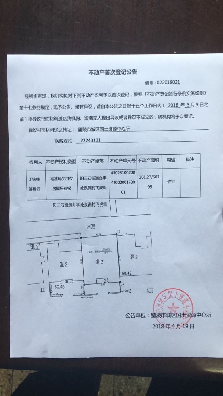 不动产首次登记公告(丁铁峰 邹碧云)