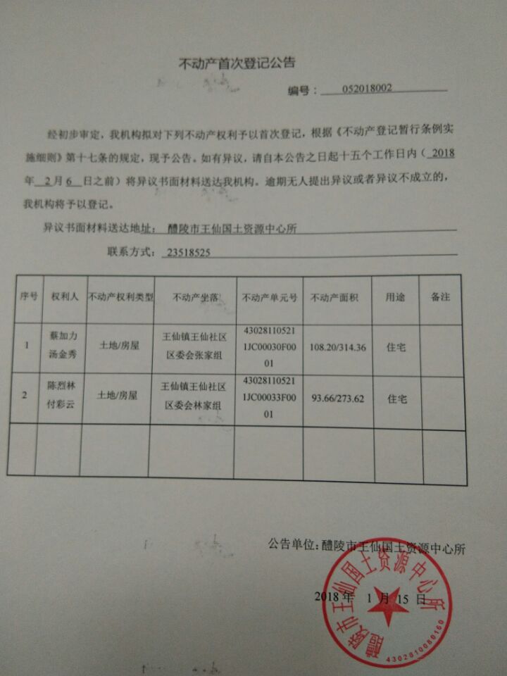 不动产首次登记公告(蔡加力 汤金秀、陈烈林 付彩云)