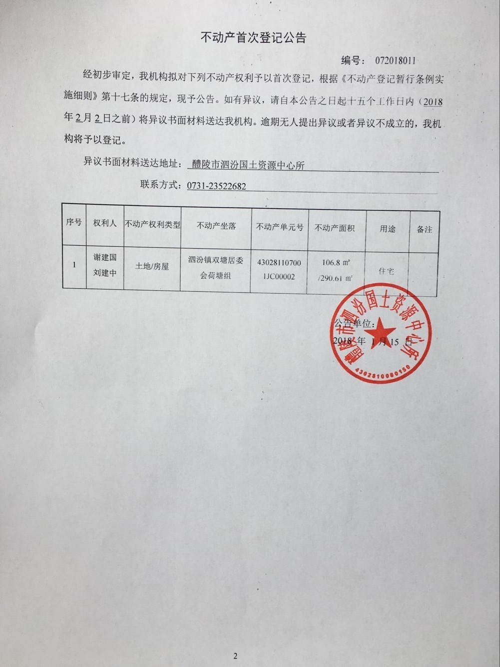 不动产首次登记公告(谢建国 刘建中)