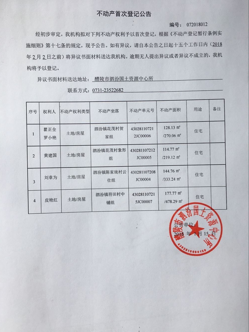 不动产首次登记公告(瞿正全 罗小艳、黄建国、刘章为、皮艳红)