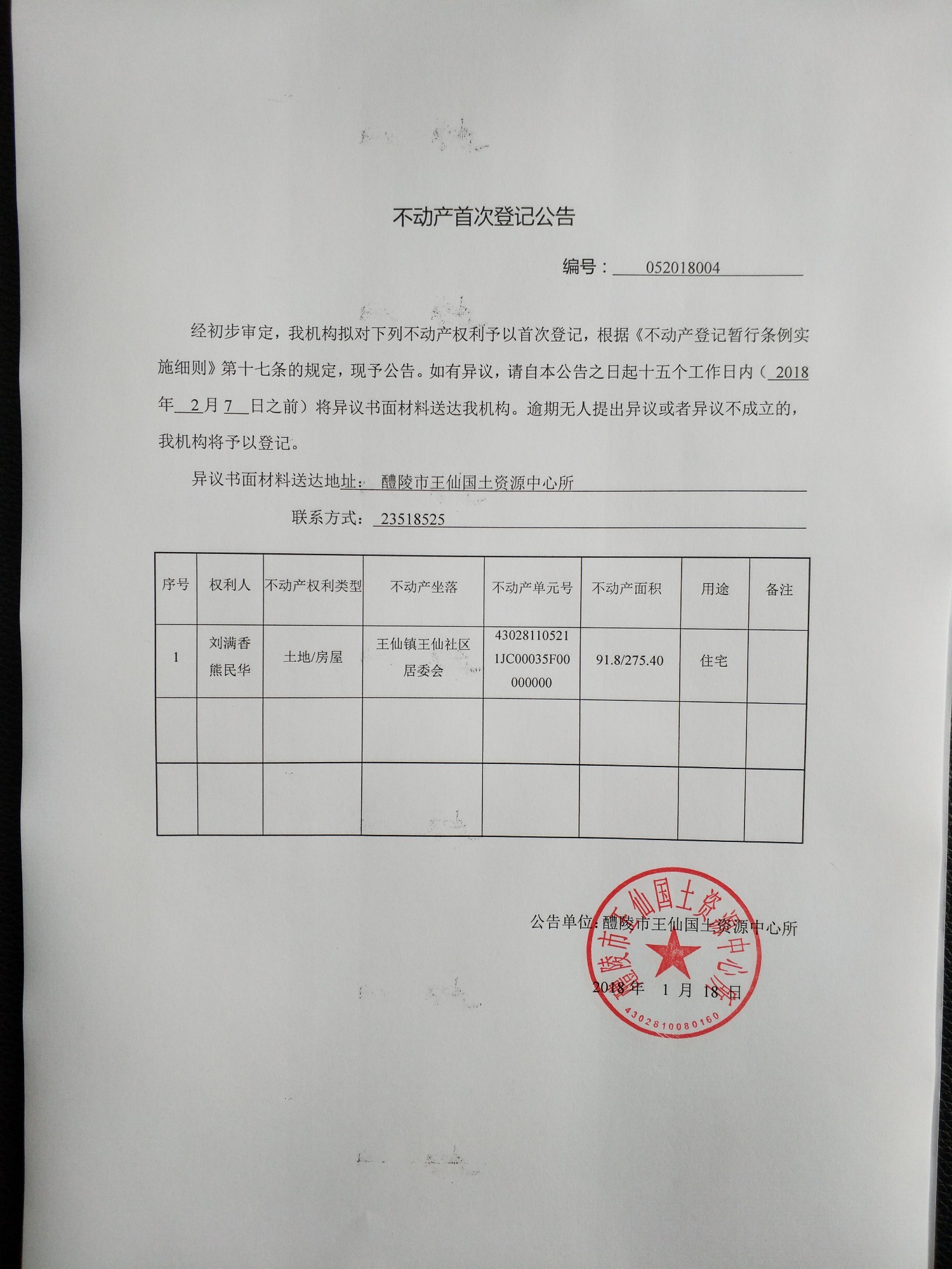 不动产首次登记公告(刘满香 熊民华)
