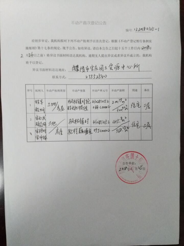 不动产首次登记公告(宋兆武 杨志娟、宋艳明 宋师球、程军 程炯)