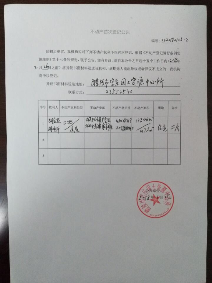 不动产首次登记公告(胡金花 胡响平)