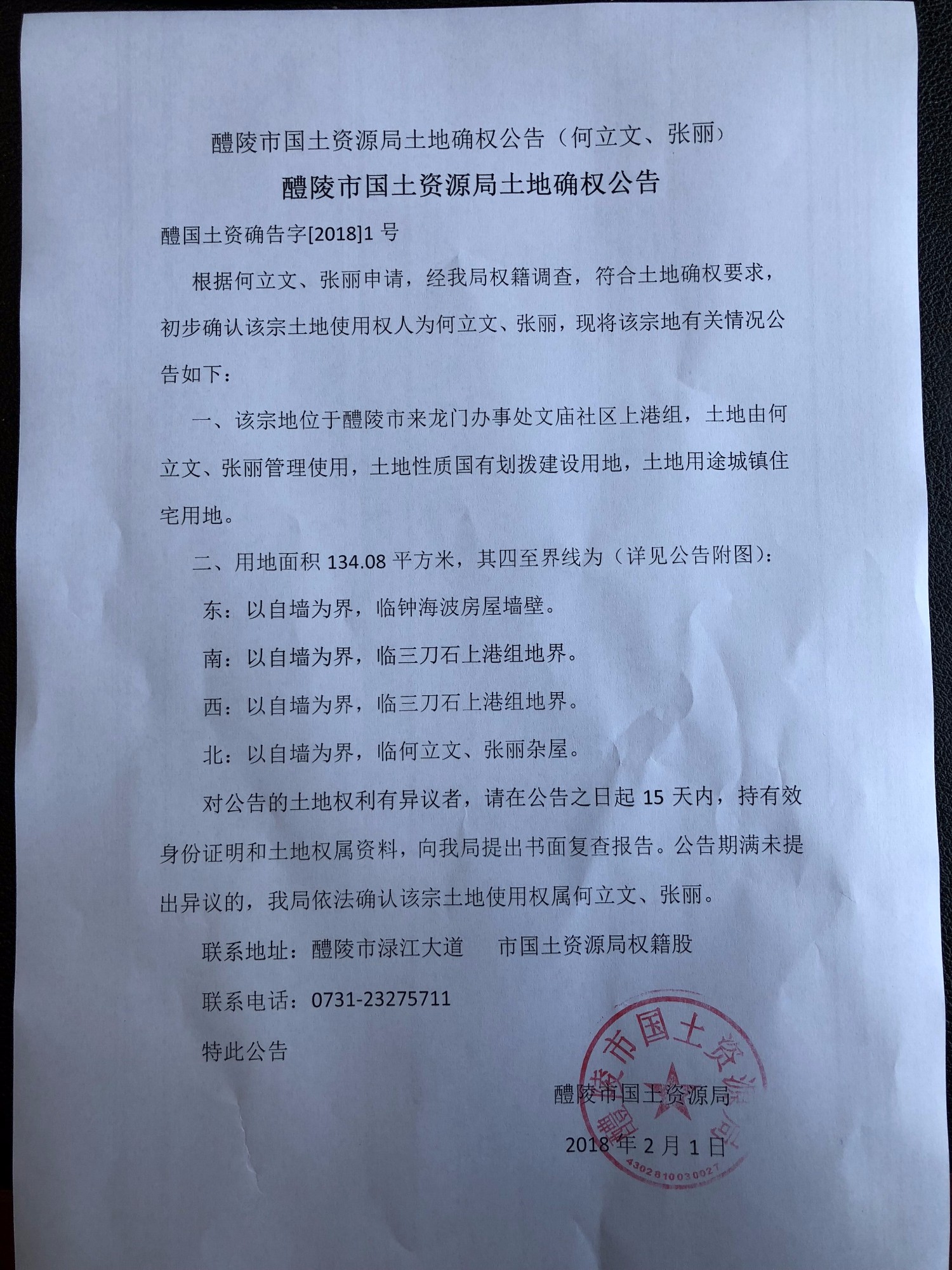 醴陵市国土资源局土地确权公告(何立文、张丽)