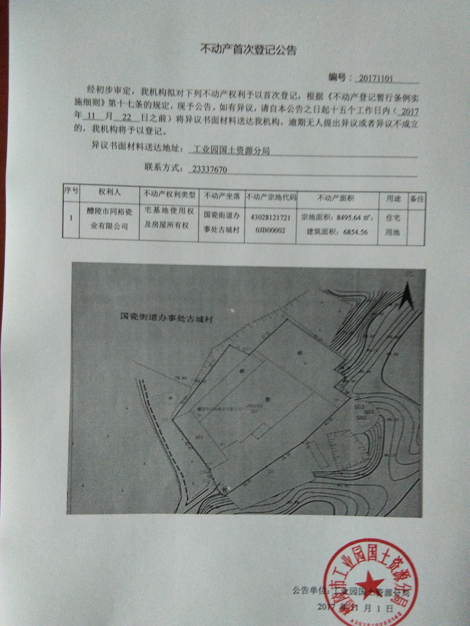 不动产首次登记公告(醴陵市同裕瓷业有限公司)