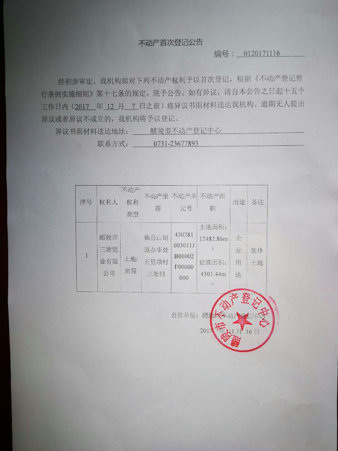 不动产首次登记公告(醴陵市三塘瓷业有限公司)