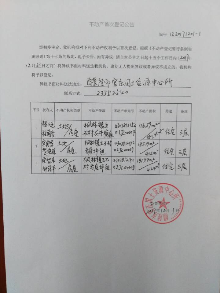 不动产首次登记公告(程三毛 程菊香丶宋勇军 贺艳琼丶宋智军 钟落平)