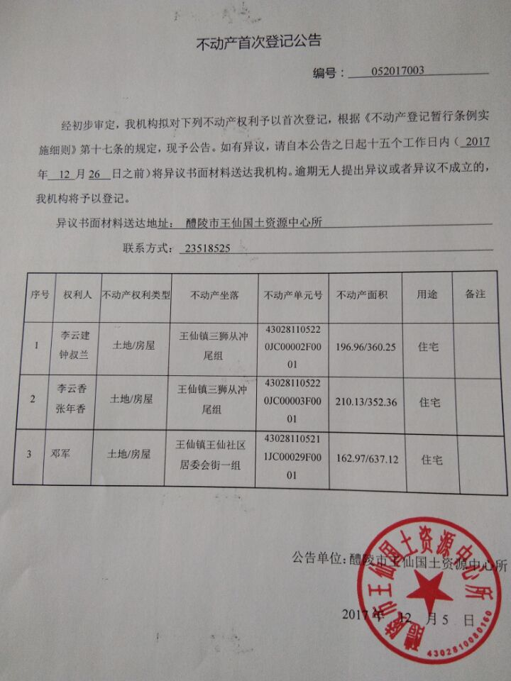 不动产首次登记公告(李云健 钟叔兰、李云香 张年香、邓军)