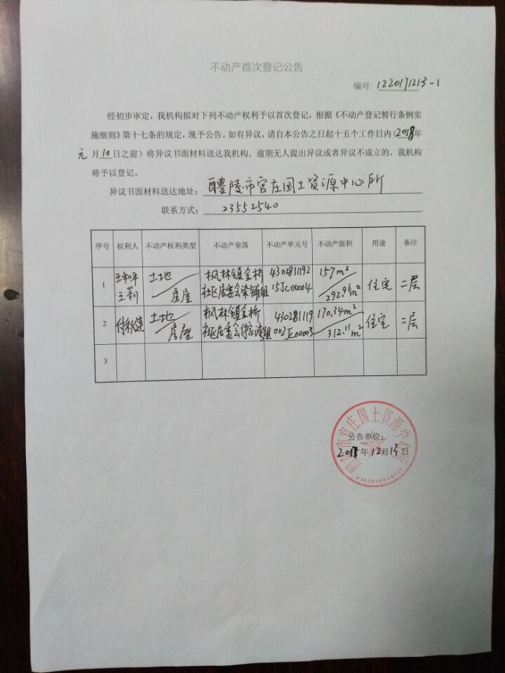 不动产首次登记公告(王和平 王莉 付秋连)