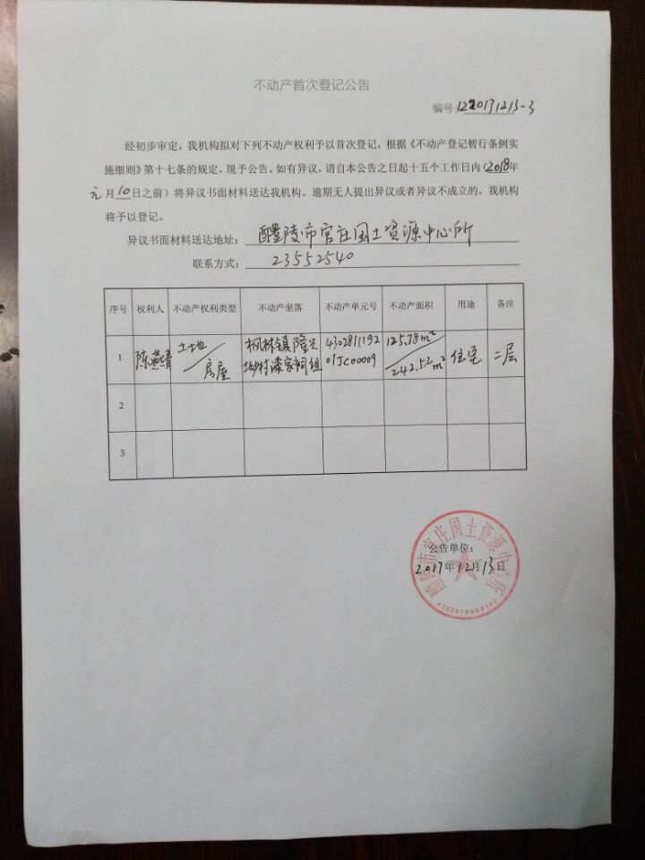 不动产首次登记公告(陈燕青)