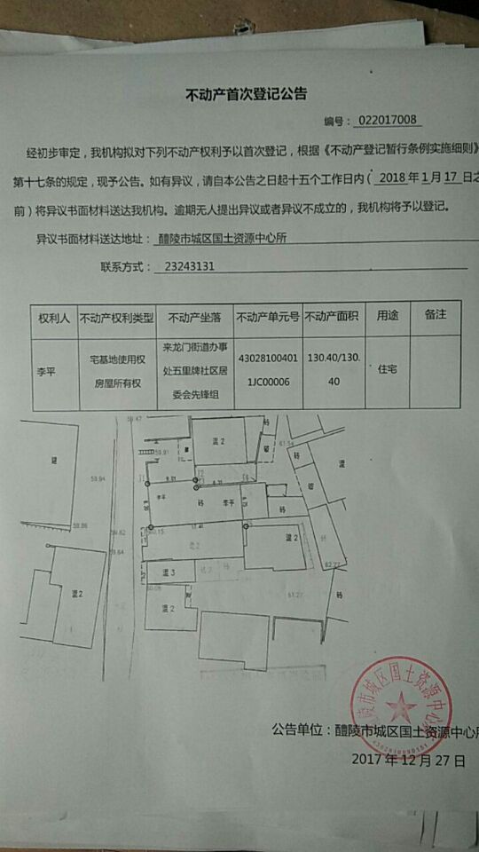 不动产首次登记公告(李平)