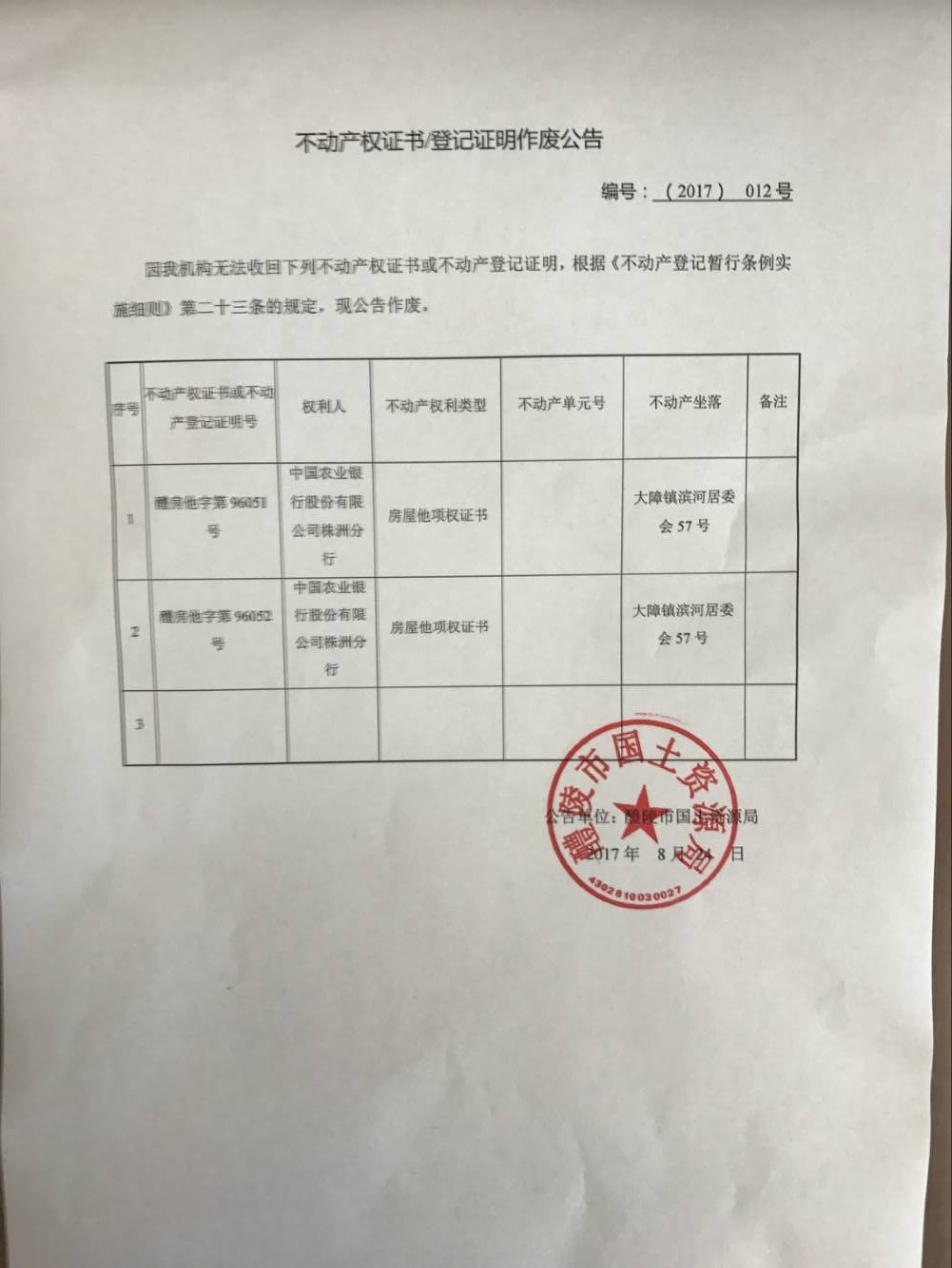 不动产权证书/登记证明作废公告(中国农业银行股份有限公司株洲分行)