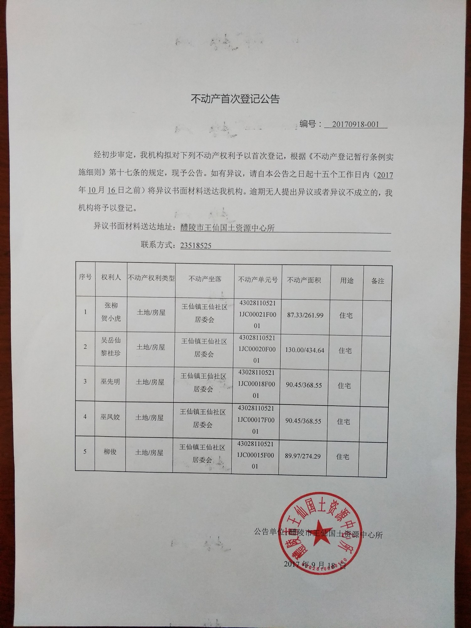 不动产首次登记公告(张柳、吴岳仙、巫先明、巫凤姣、柳俊)