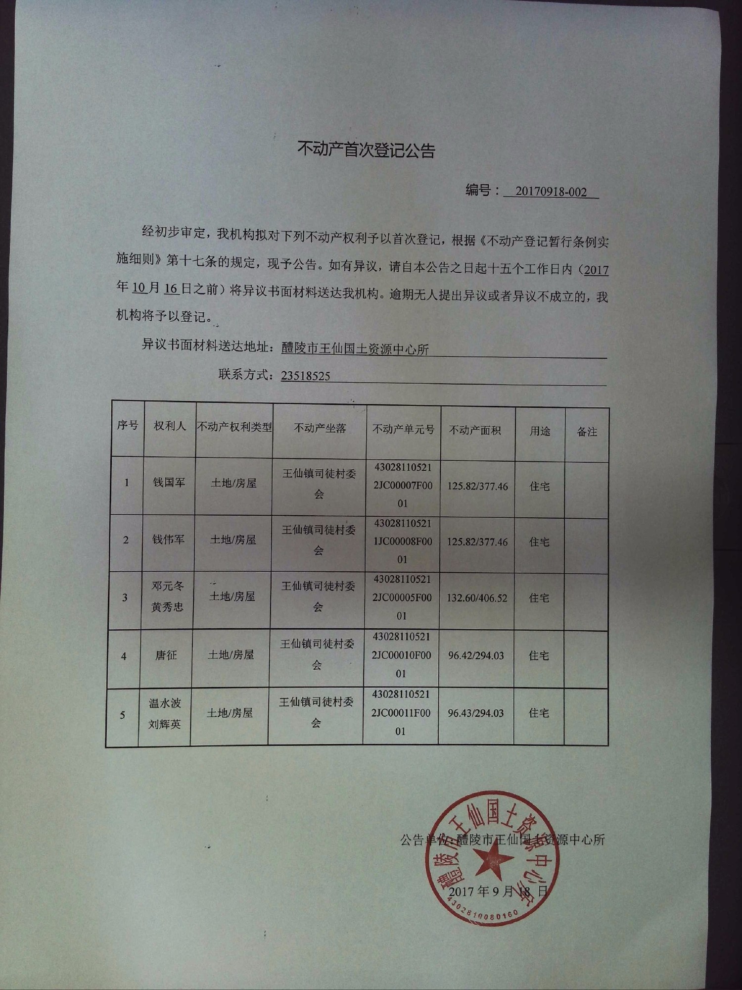 不动产首次登记公告(钱国军、钱伟军、邓元冬、唐征、温水波)