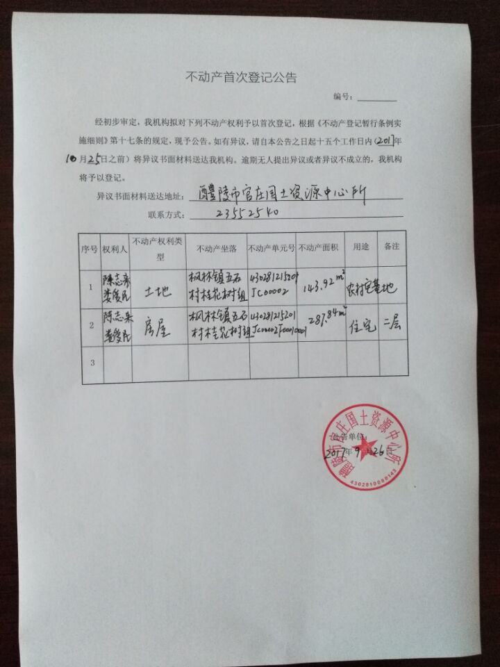 不动产首次登记公告(陈志来 娄爱民)
