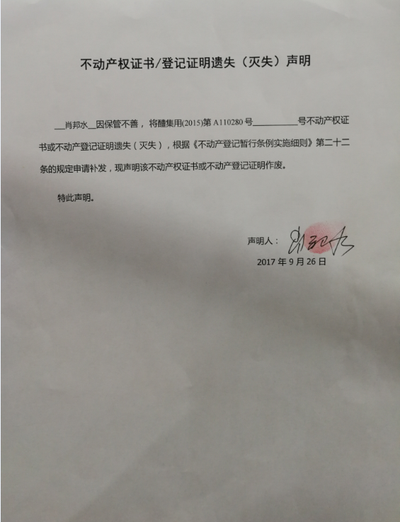 不动产权证书/登记证明遗失(丢失)声明 肖邦水