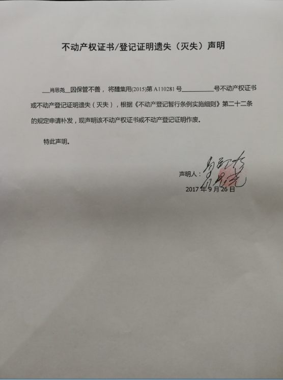 不动产权证书/登记证明遗失(丢失)声明 肖思尧