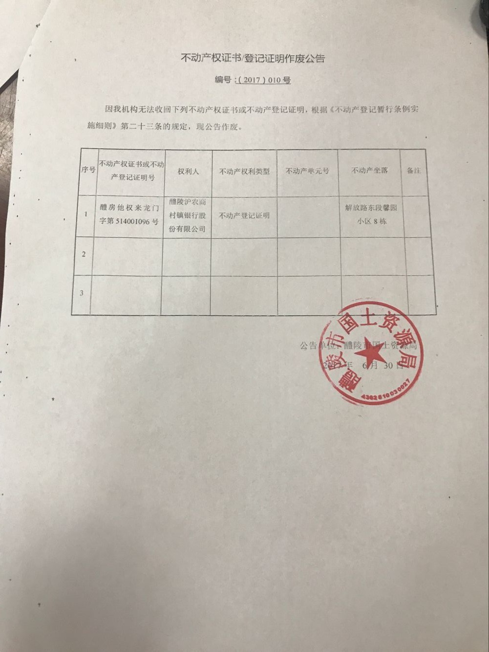 不动产权证书/登记证明作废公告(醴陵沪农商村镇银行股份有限公司)