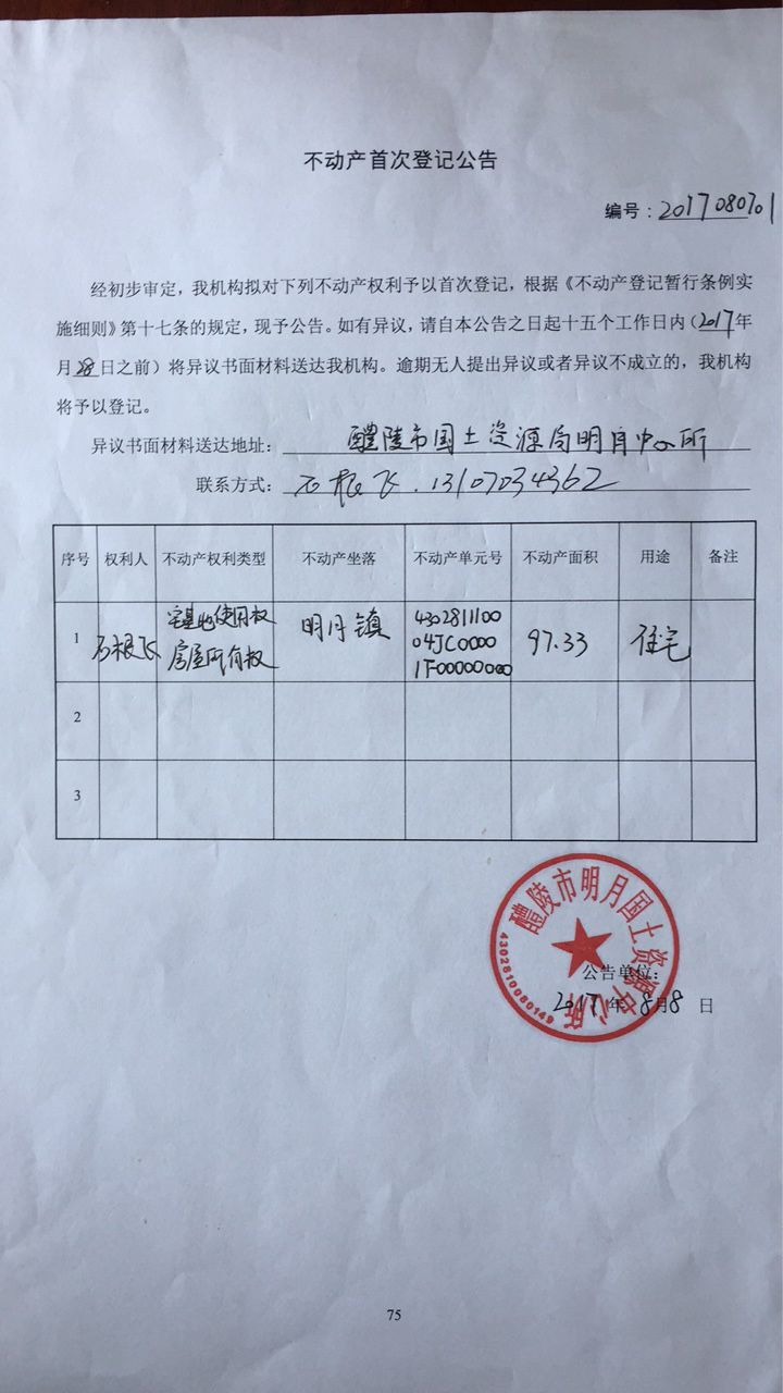 不动产首次登记公告(石根飞)