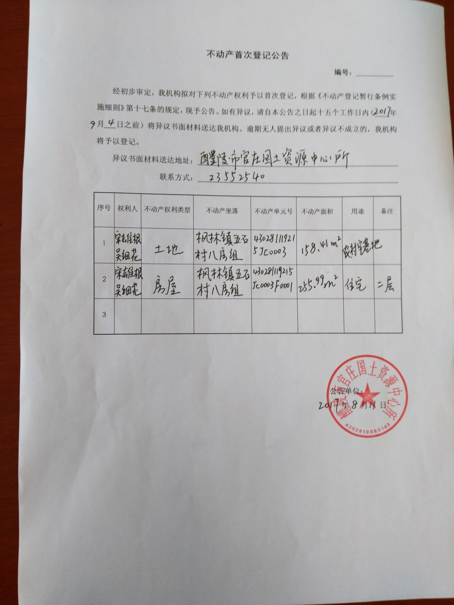 不动产首次登记公告(宋雄根、吴细花)