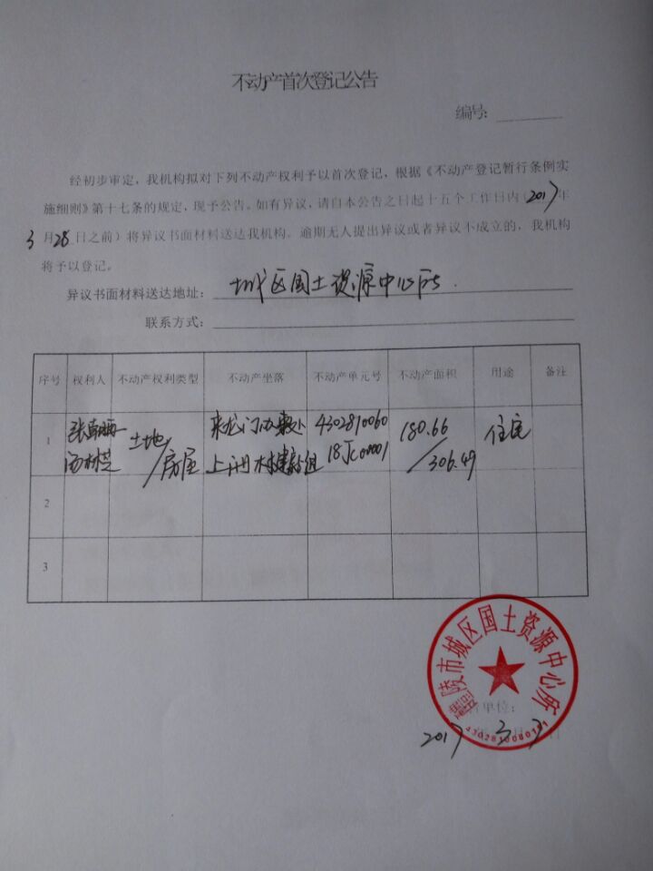 不动产首次登记公告(张朝再、汤林芝)