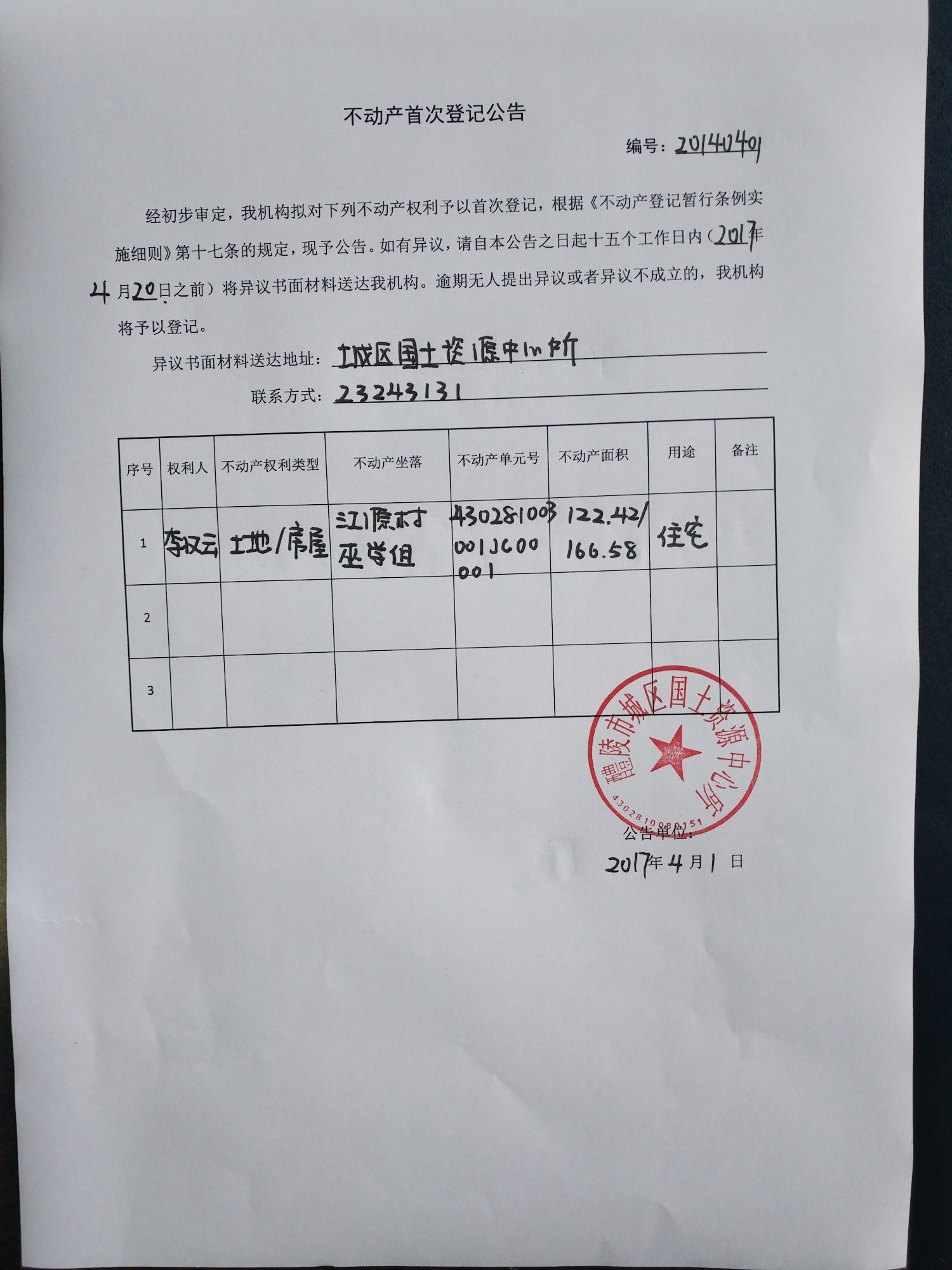 不动产首次登记公告(李汉云)
