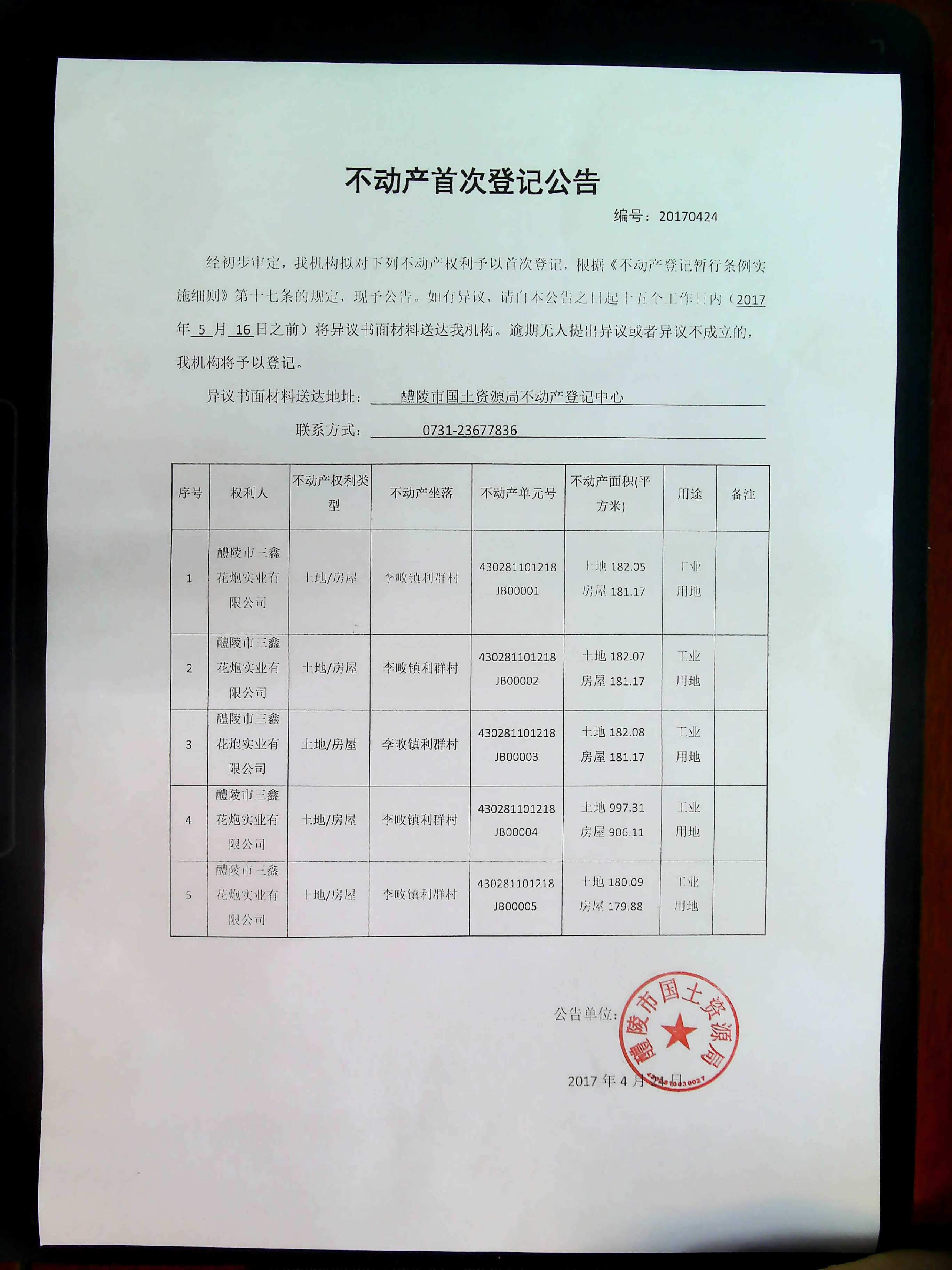 不动产首次登记公告(醴陵市三鑫花炮实业有限公司)
