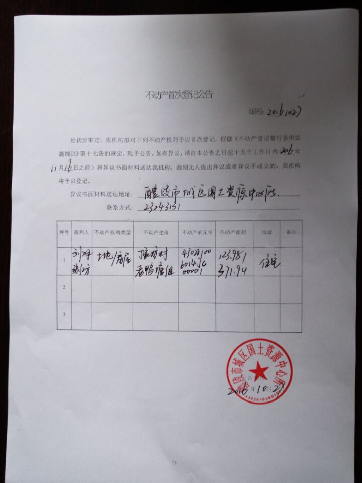 不动产首次登记公告(刘解、张红方)