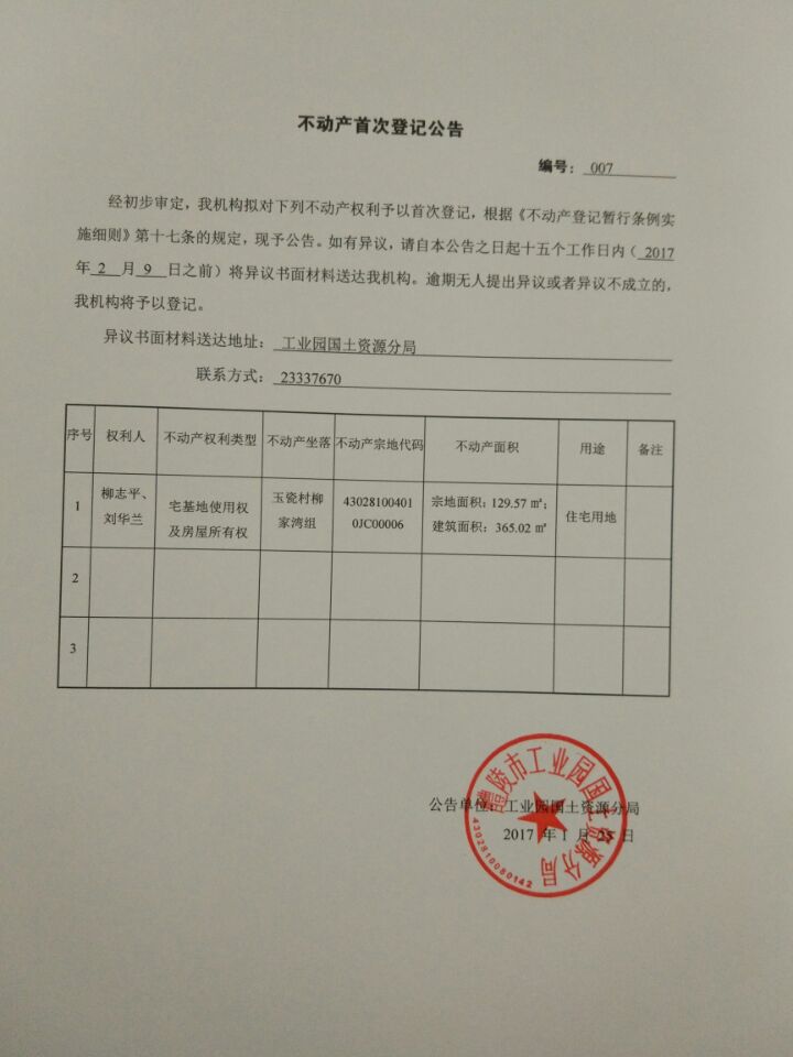 不动产首次登记公告(柳志平、刘华兰)