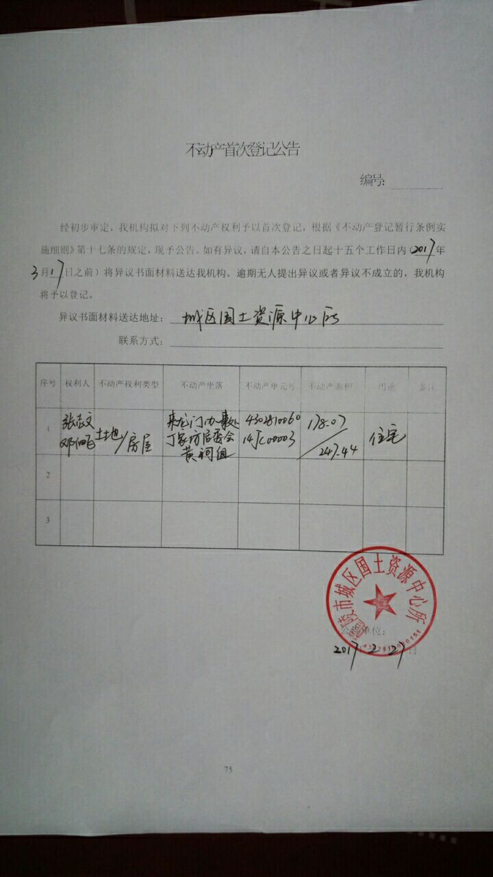 不动产首次登记公告(张志文、邓细飞)