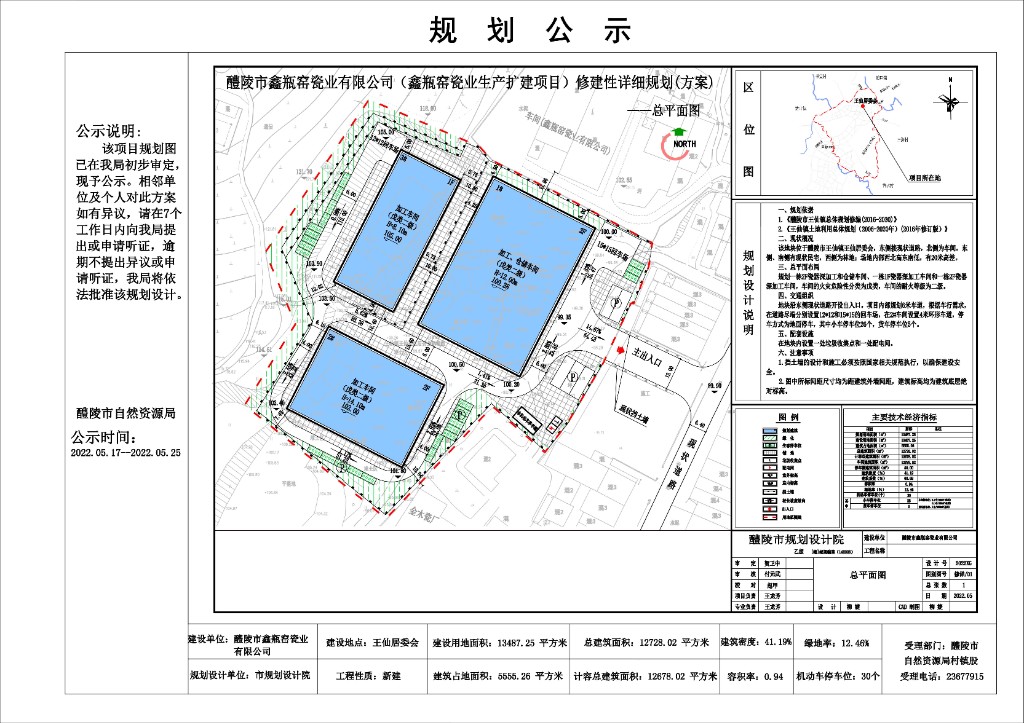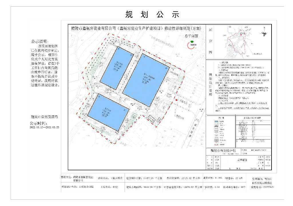 醴陵市鑫瓶窑瓷业有限公司(鑫瓶窑瓷业生产扩建项目)修建性详细规划(方案)总平面图公示