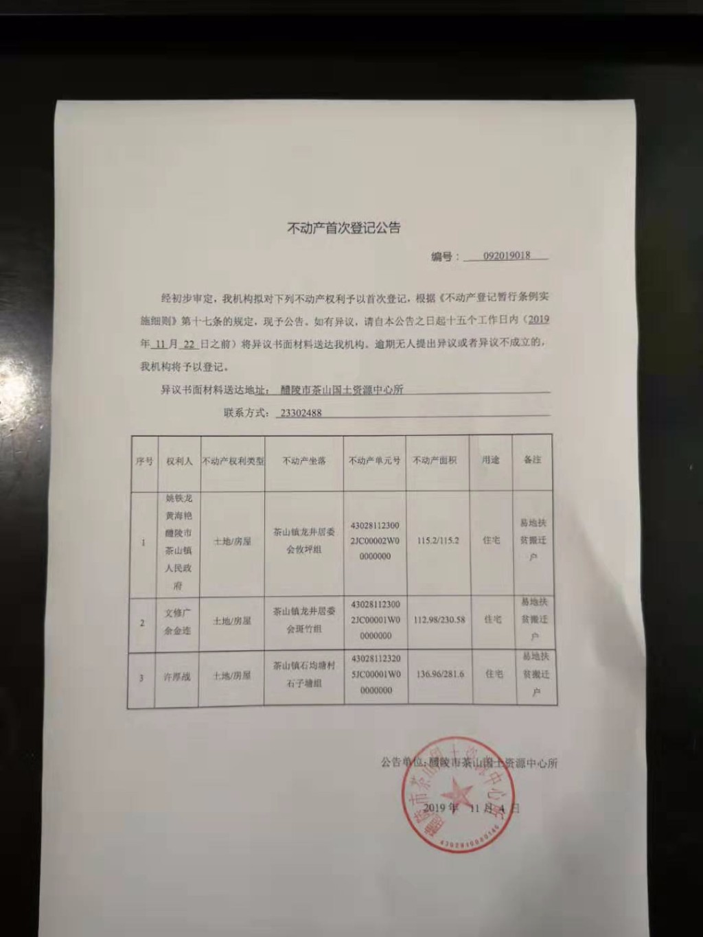不动产首次登记公告(姚铁龙、黄海艳、文修广、余金连、许厚战、醴陵市茶山镇人民政府、)