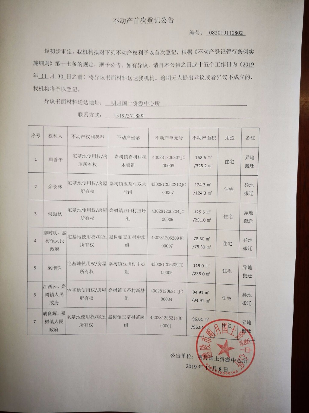 不动产首次登记公告(唐善平、余长林、何振秋、廖时明、梁细软、江西云、胡良辉、嘉树镇人民政府)