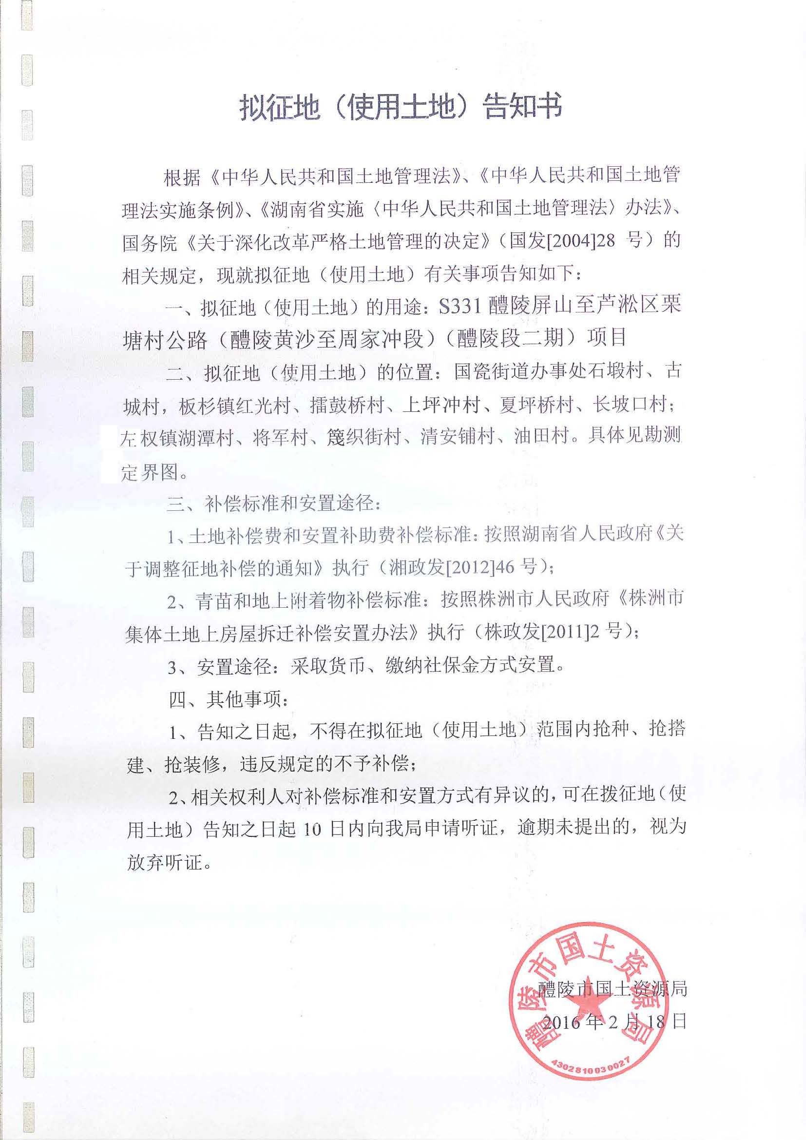 S331醴陵屏山至芦淞区栗塘村公路(醴陵黄沙至周家冲段)(醴陵段二期)项目