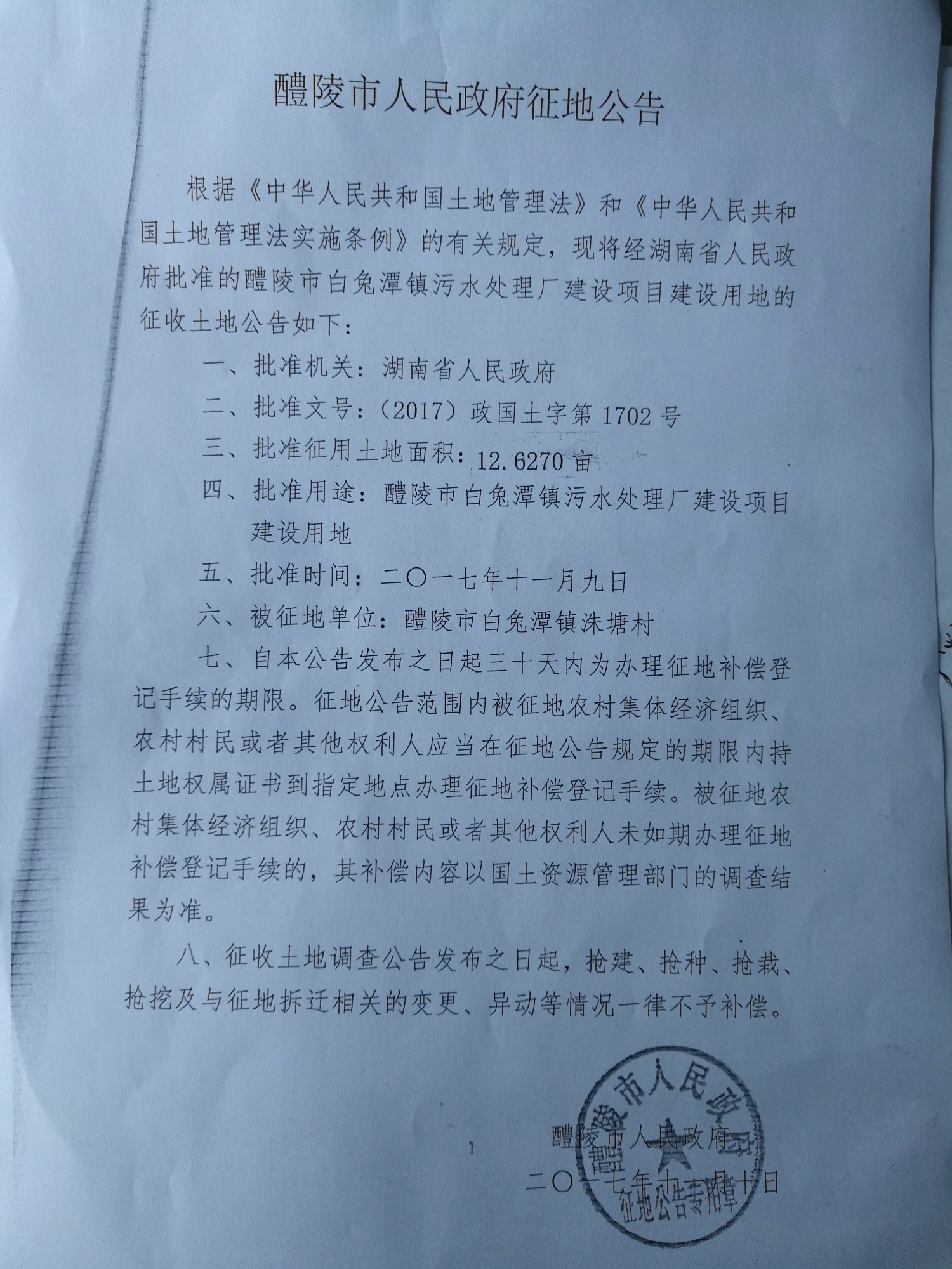 醴陵市人民政府征地公告(醴陵市白兔潭镇污水处理厂建设项目)