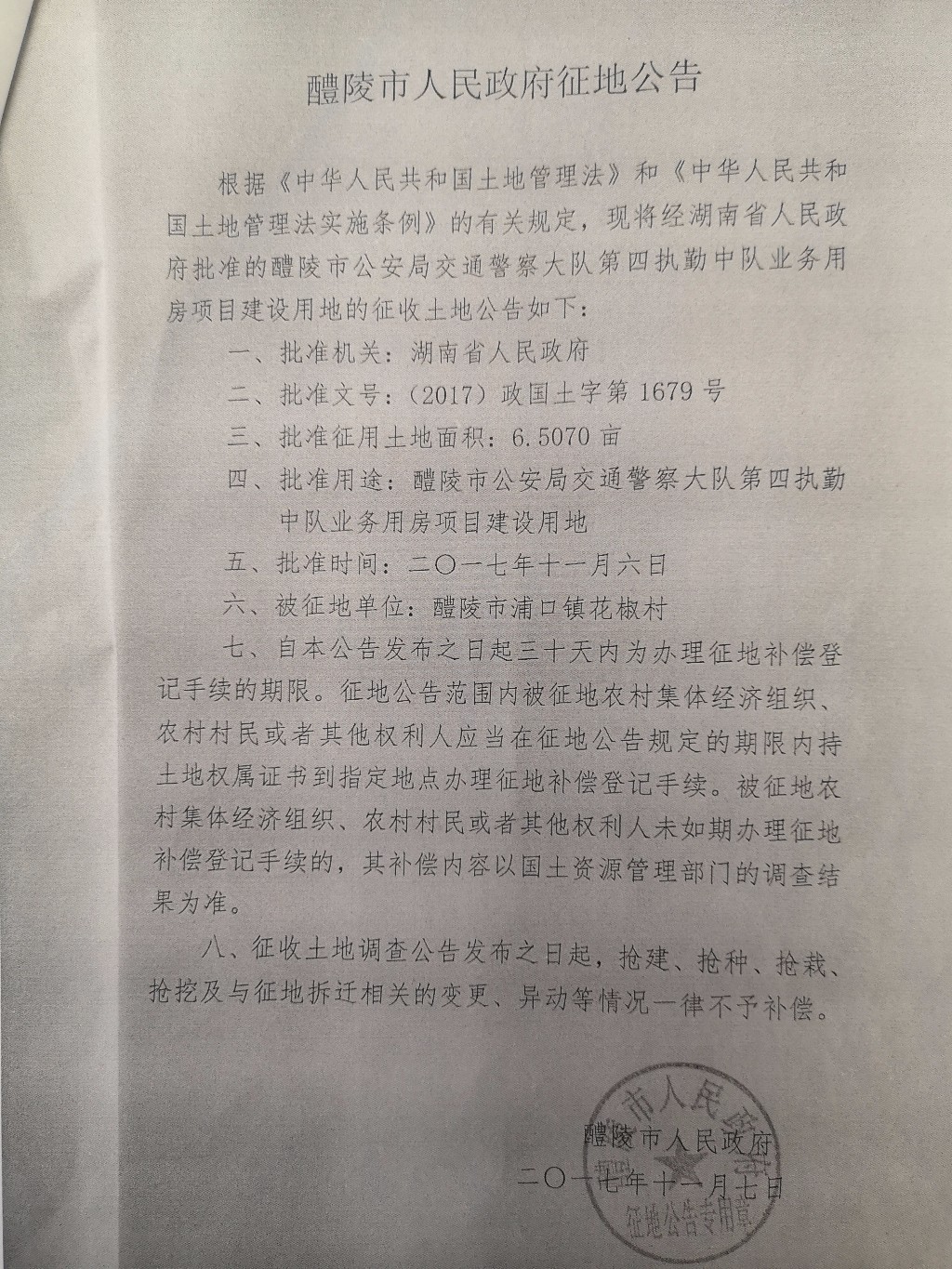 醴陵市人民政府征地公告(醴陵市公安局交通警察大队第四执勤中队业务用房项目)