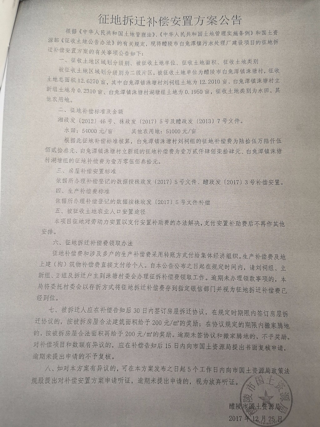 征地拆迁补偿安置方案公告(醴陵市白兔潭污水处理厂)