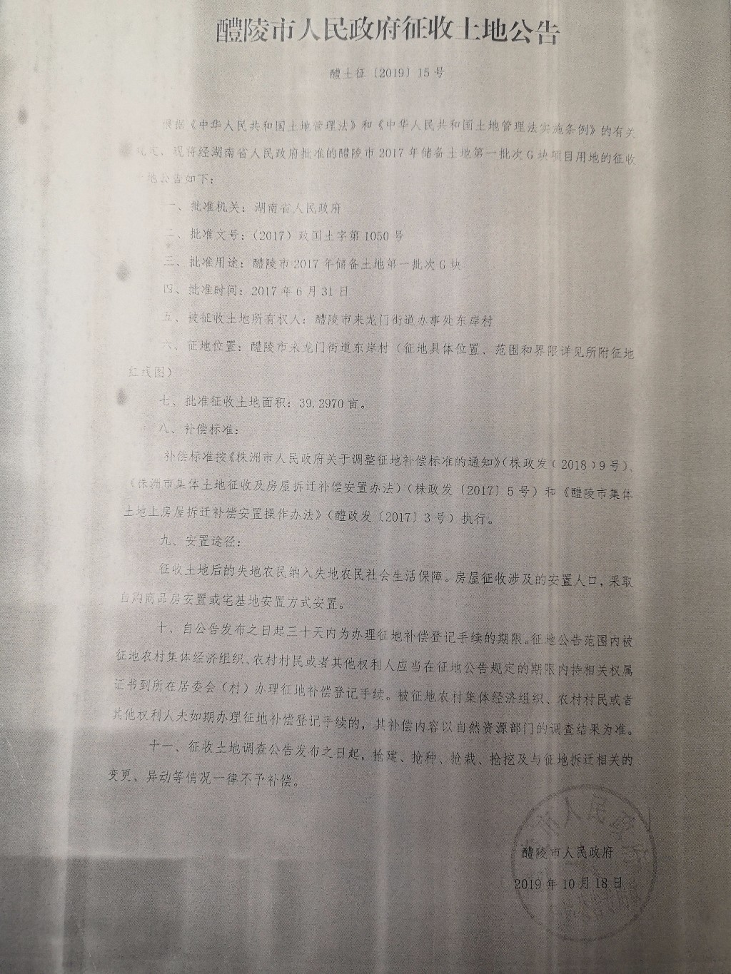 醴陵市人民政府征地公告(醴陵市2017年储备土地第一批次G块)