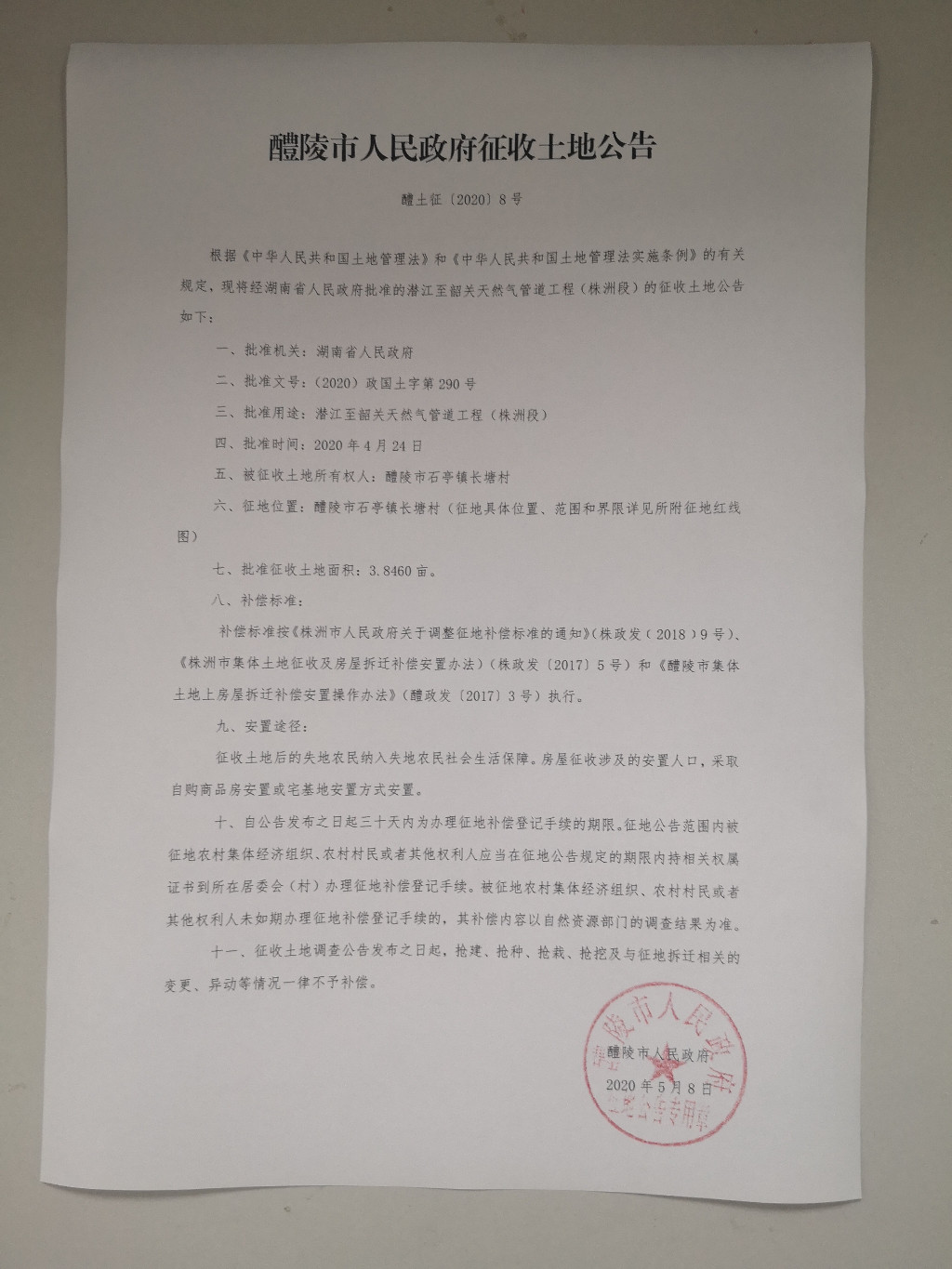 醴陵市人民政府征收土地公告(潜江至韶关天然气管道工程(株洲段))