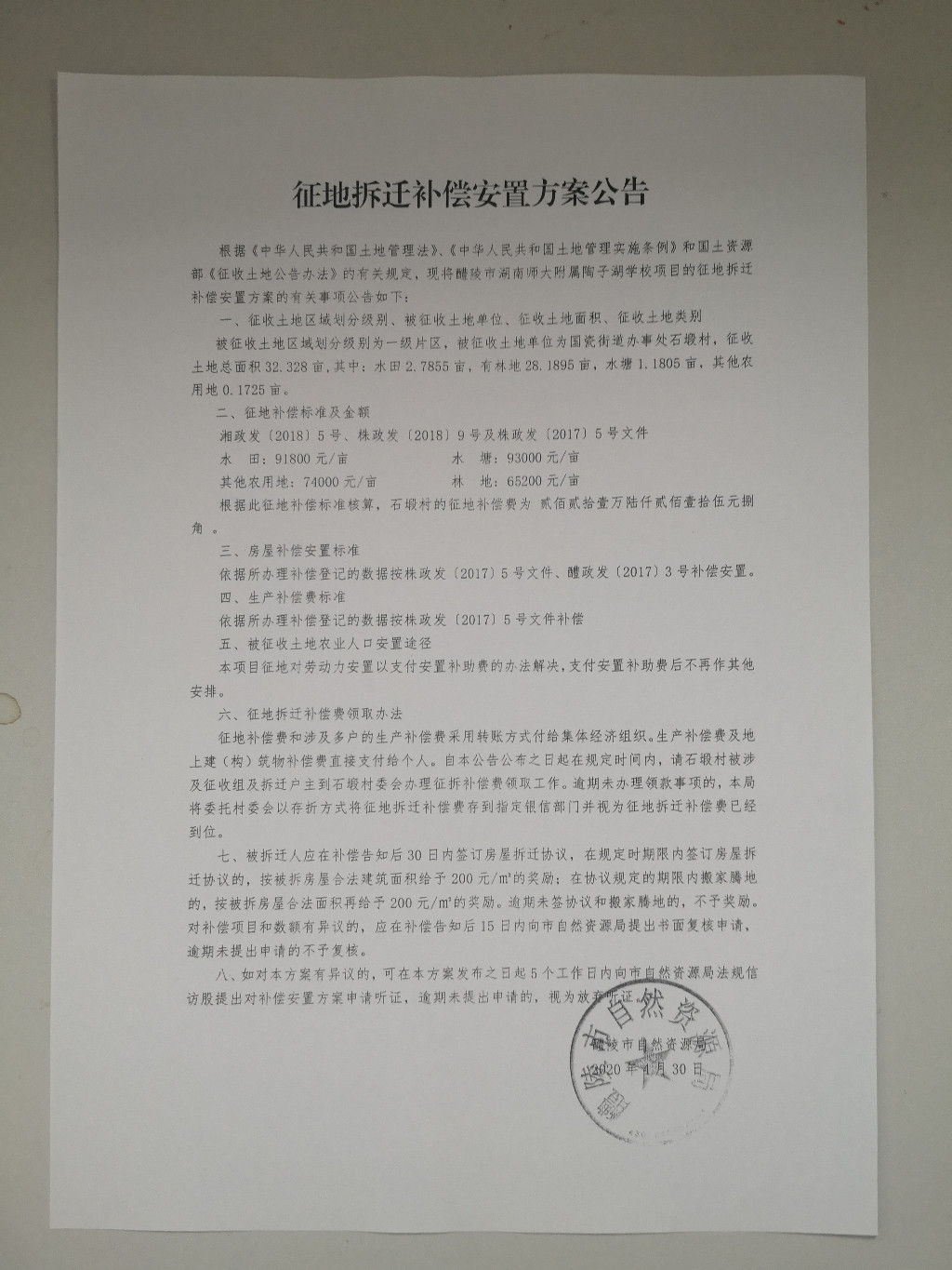 征地拆迁补偿安置方案公告(醴陵市湖南师大附属陶子湖学校 石塅村)