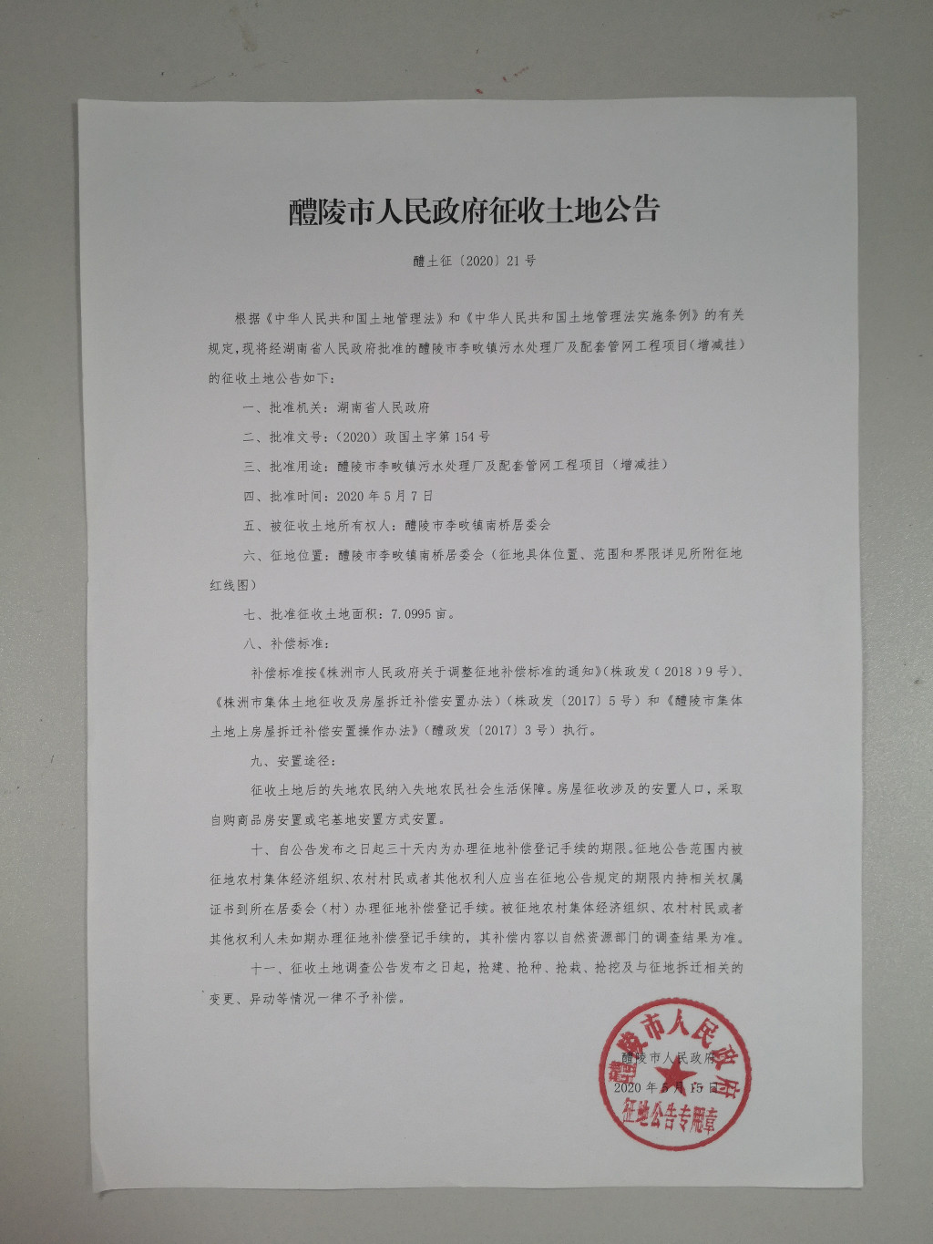 醴陵市人民政府征收土地公告(醴陵市李畋镇污水处理厂及配套管网工程项目(增减挂))