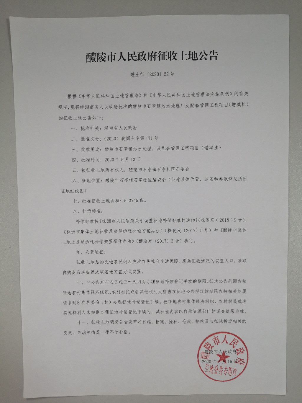 醴陵市人民政府征收土地公告(醴陵市石亭镇污水处理厂及配套管网工程项目(增减挂))