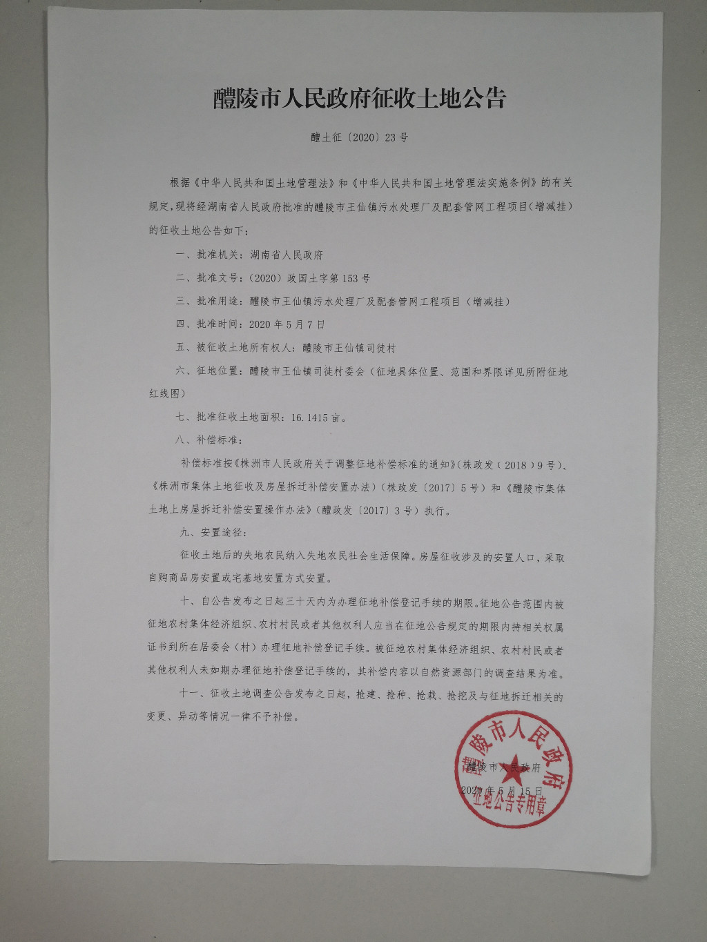醴陵市人民政府征收土地公告(醴陵市王仙镇污水处理厂及配套管网工程项目(增减挂))