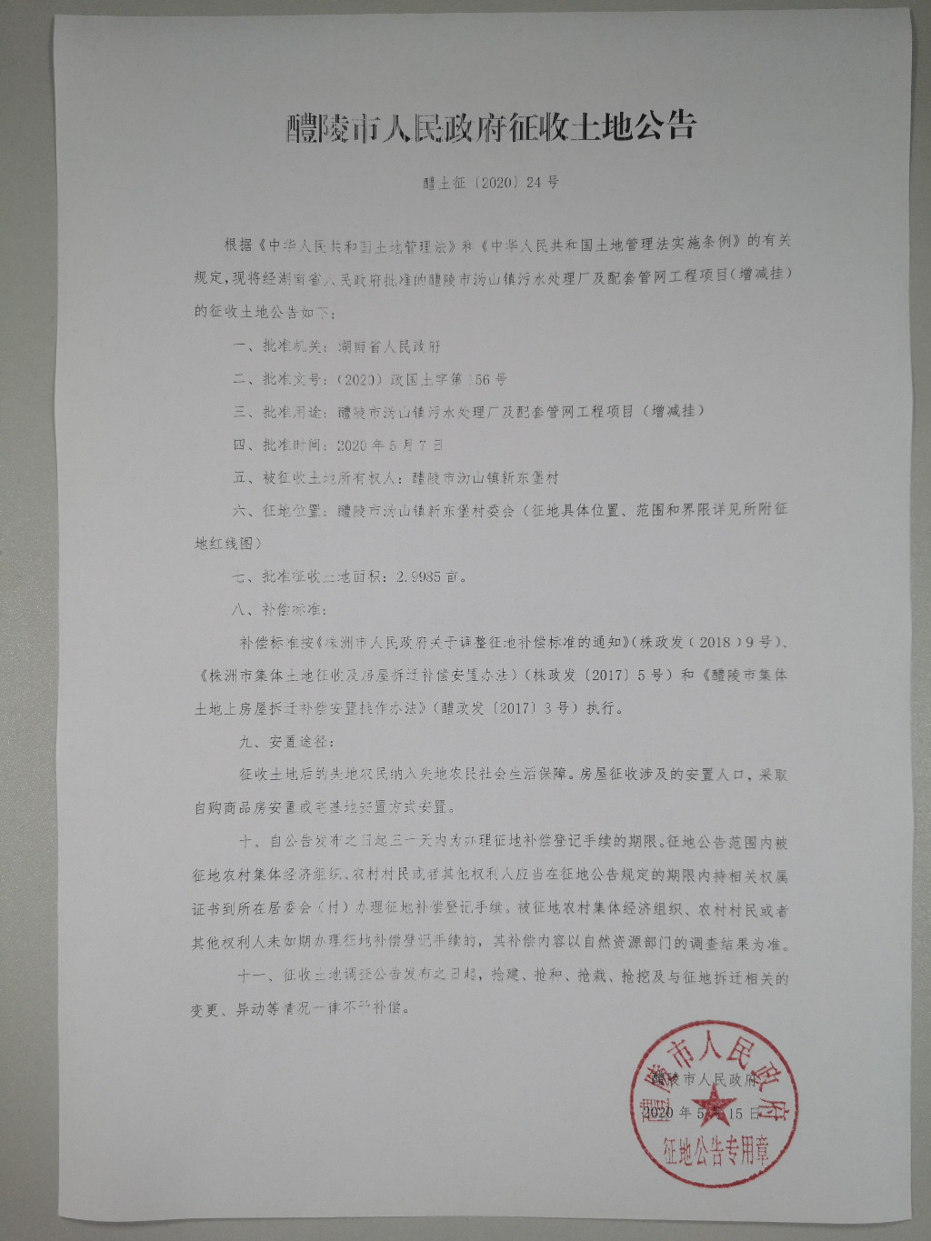 醴陵市人民政府征收土地公告(醴陵市沩山镇污水处理厂及配套管网工程项目(增减挂))