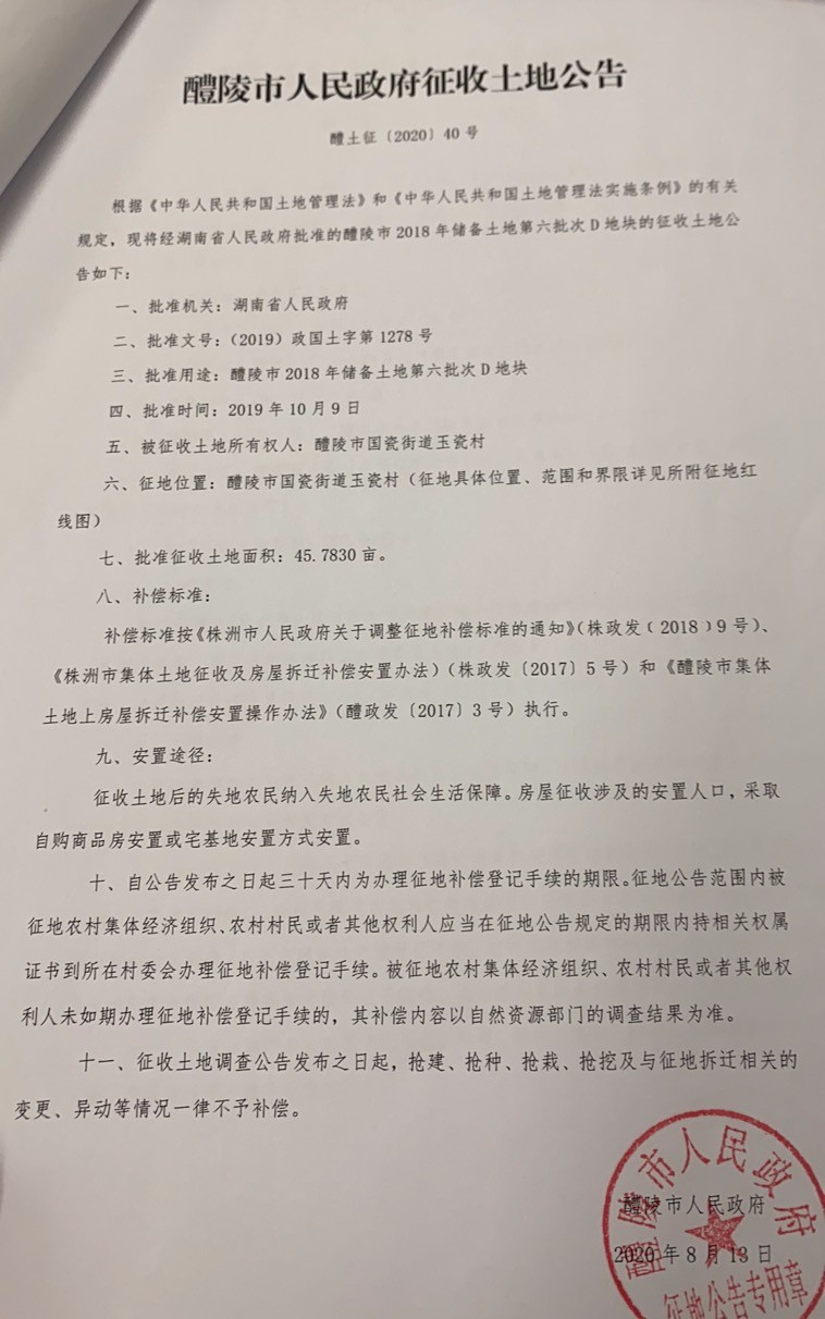 醴陵市人民政府征收土地公告(醴陵市2018年储备土地第六批次D地块)