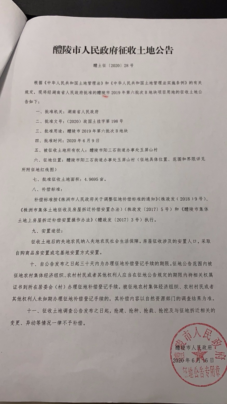 醴陵市人民政府征收土地公告(醴陵市2019年第六批次B地块)