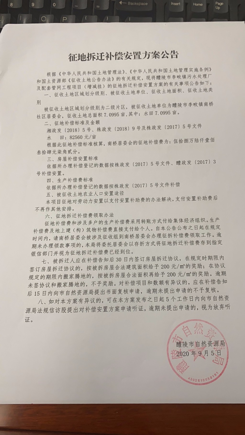 征地拆迁补偿安置方案公告(醴陵市李畋镇污水处理厂及配套管网工程项目)