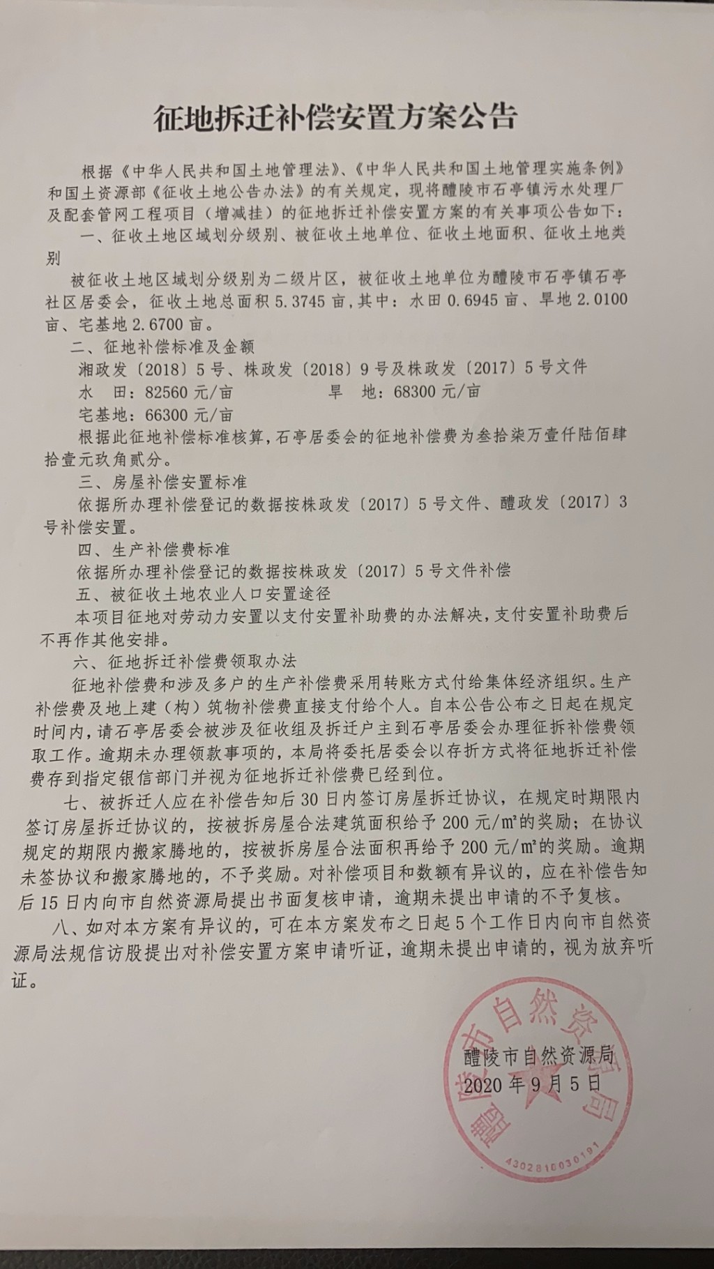 征地拆迁补偿安置方案公告(醴陵市石亭镇污水处理厂及配套管网工程项目)